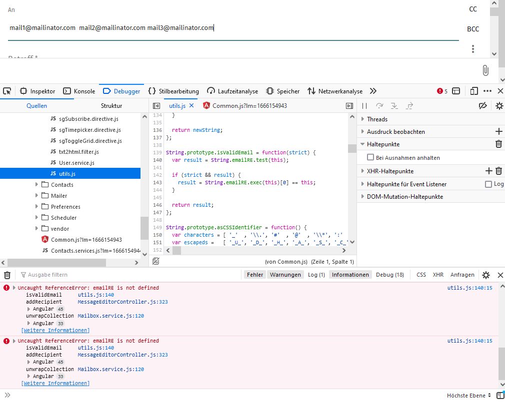I also tried the above pr fix but this doesn't seem to solve the issue. I applied it on the files on the server where SOGo is running. I receive the following error in the console after filling in the email addresses: ReferenceError: emailRE is not defined And the following after clicking to another field : Uncaught ReferenceError: emailRE is not defined |