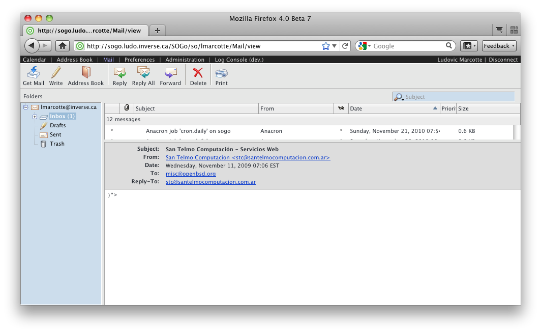 | Additional Information | this happens always. In case there are many mails in hte folder, someone needs to scroll to the evil mail. Happens on OpenBSD i386, libiconv-1.13p2, sope/sogo 1.3.4, gnustep-base-1.20.1p0, I also tried with libiconv-1.13.1, but its still aborting. uncommenting the free(cd); in iconv_close() in libiconv, then the error doesn't happen, but I think the problem is somewhere in sope and not in libiconv. in sogod.log I see: | ||||