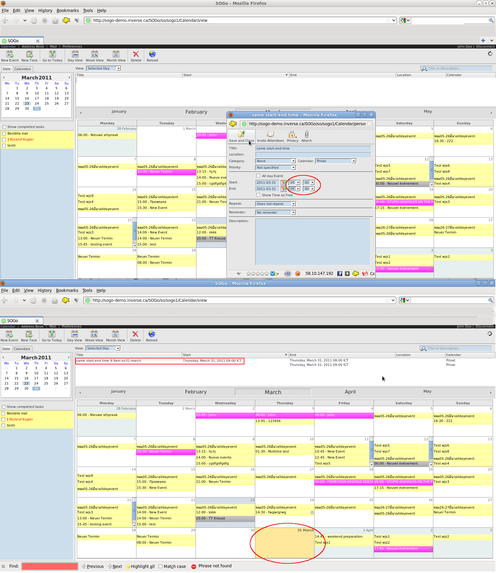 | Description | Tested in http://sogo-demo.inverse.ca/SOGo/so/ As User: sogo1 Create an event with the same Start and End time from WebGUI will not appear on the calendar table but in list pane However there is no problem when create an event with the same Start and End time on Lightning, the event will be displayed in both calendar and in event list pane. | ||||