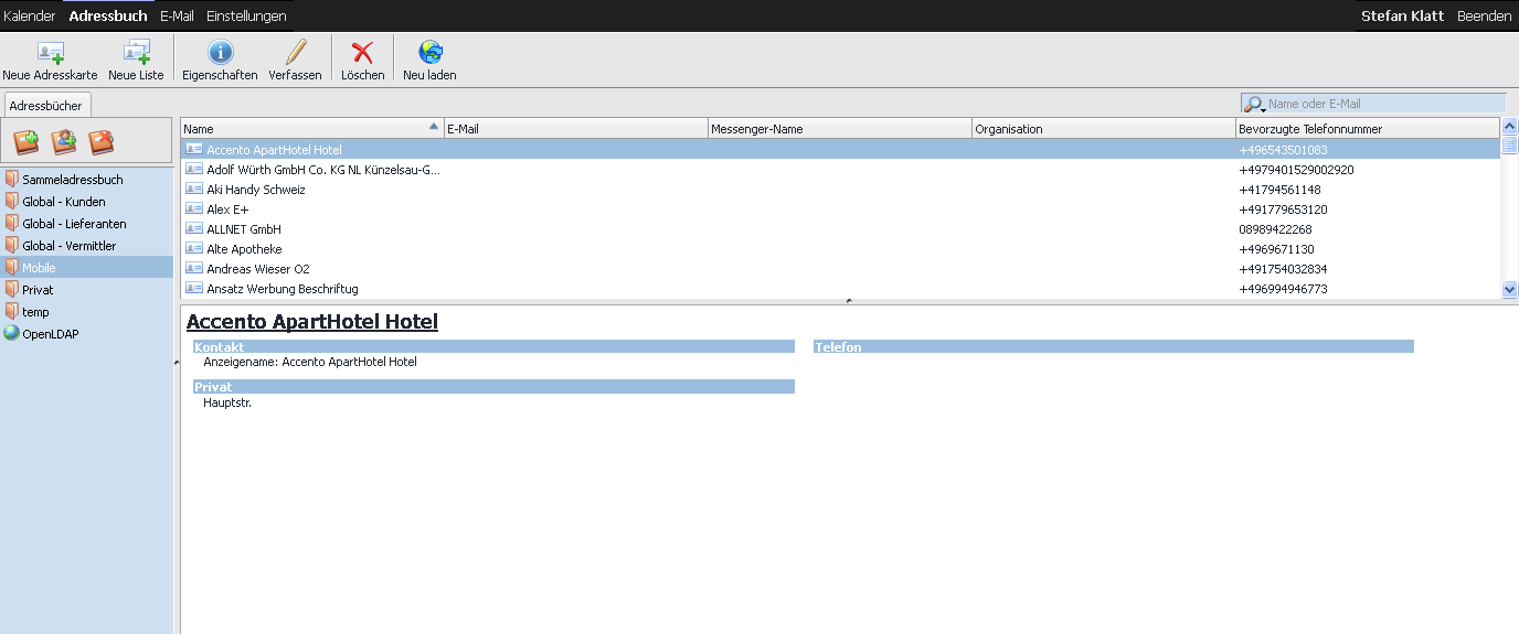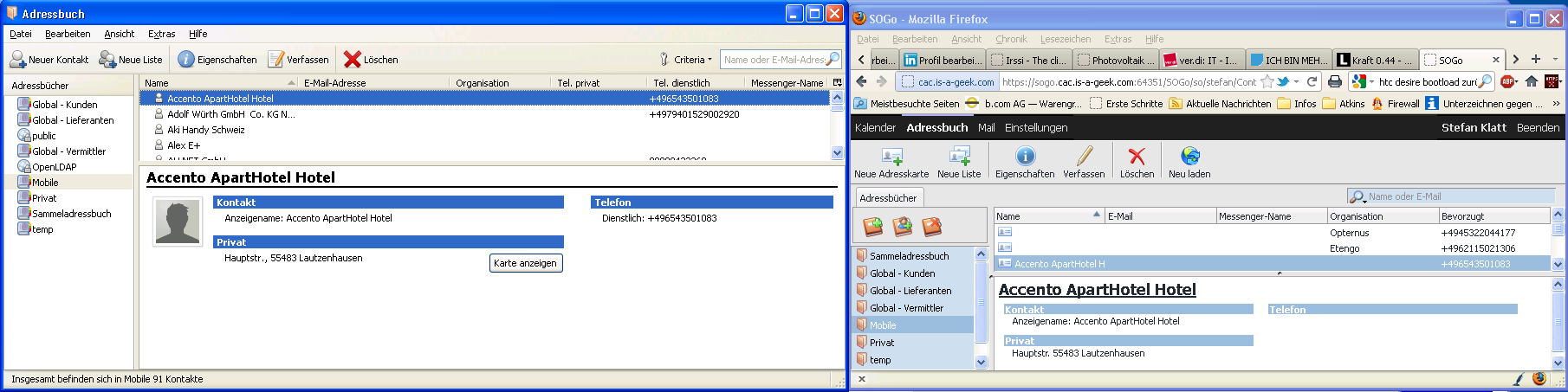 | Description | Take a look on the uploaded picture. It shows two errors: 1.) I synched the contact "Accento ApartHotel Hotel" from my Android phone. There was one error, the phone number was "other". I changed it on the phone to "office" and synched again. After this I get the information displayed like on the uploaded picture shown :-( Thunderbird displays it correct, SOGo Webfrontend not. The "office" number is ignored, only shown as featured number. 2.) Contacts without name, only with the company name are displayed without name. Thunderbird displays it correct. Additional I found a third display error: If I sychronize a contact only with a "other" telephon number, SOGo displays the telephone number only as featured number, at the properties this number isn't displayed. | ||||