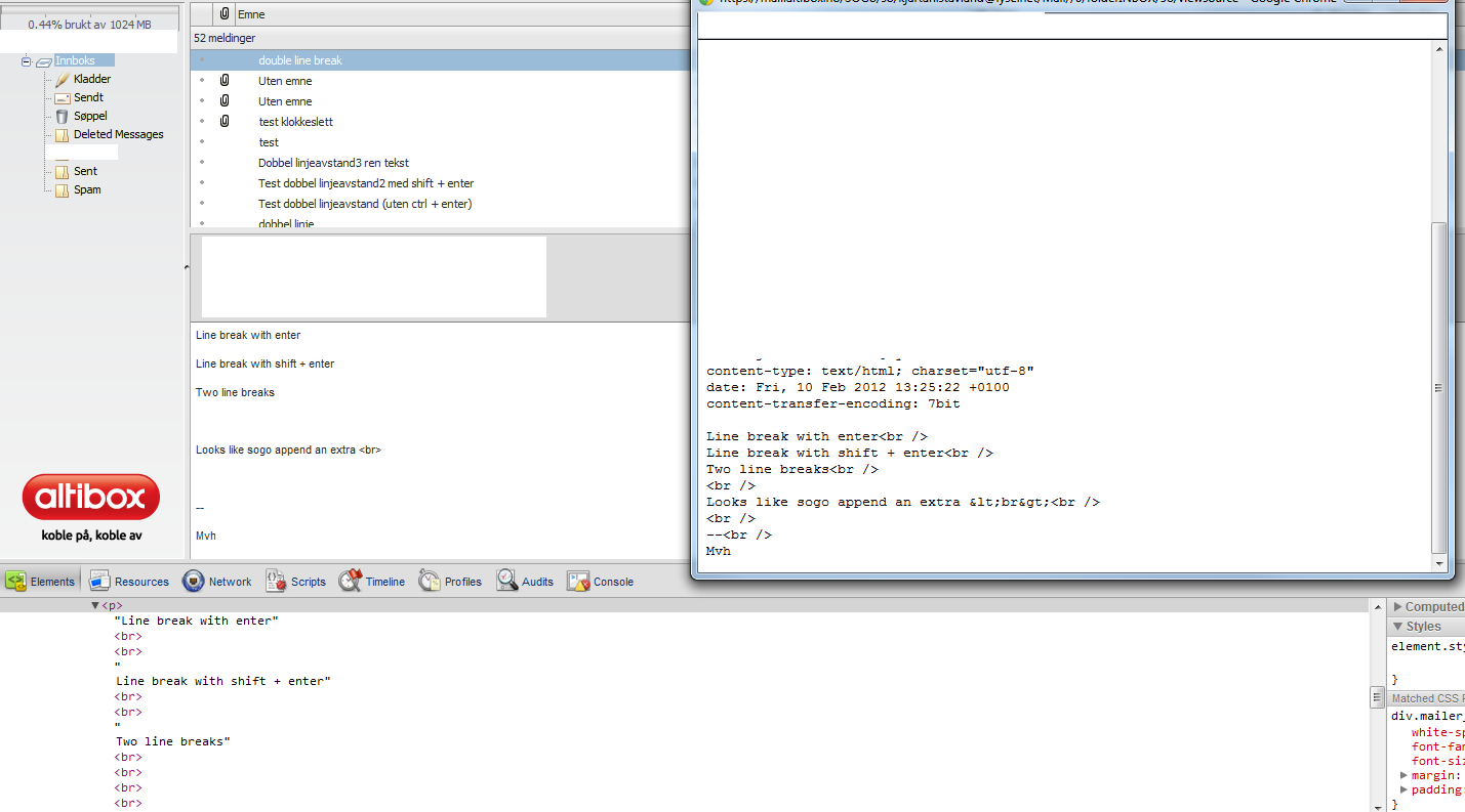 | Description | Hi, We are having problems with mail viewed in sogo webmail have double line breaks. The problem only occures when the mail is sent and read by Sogo webmail (html style). So if i send the same mail as plain text, or from gmail/outlook, the mail is showned without double line breaks. From the attached screenshot, it looks like Sogo appends an extra <br> at the end of a line. The window to the right shows the message source, while the other window is the google chrome inspector. | ||||