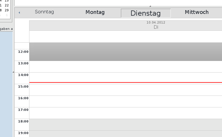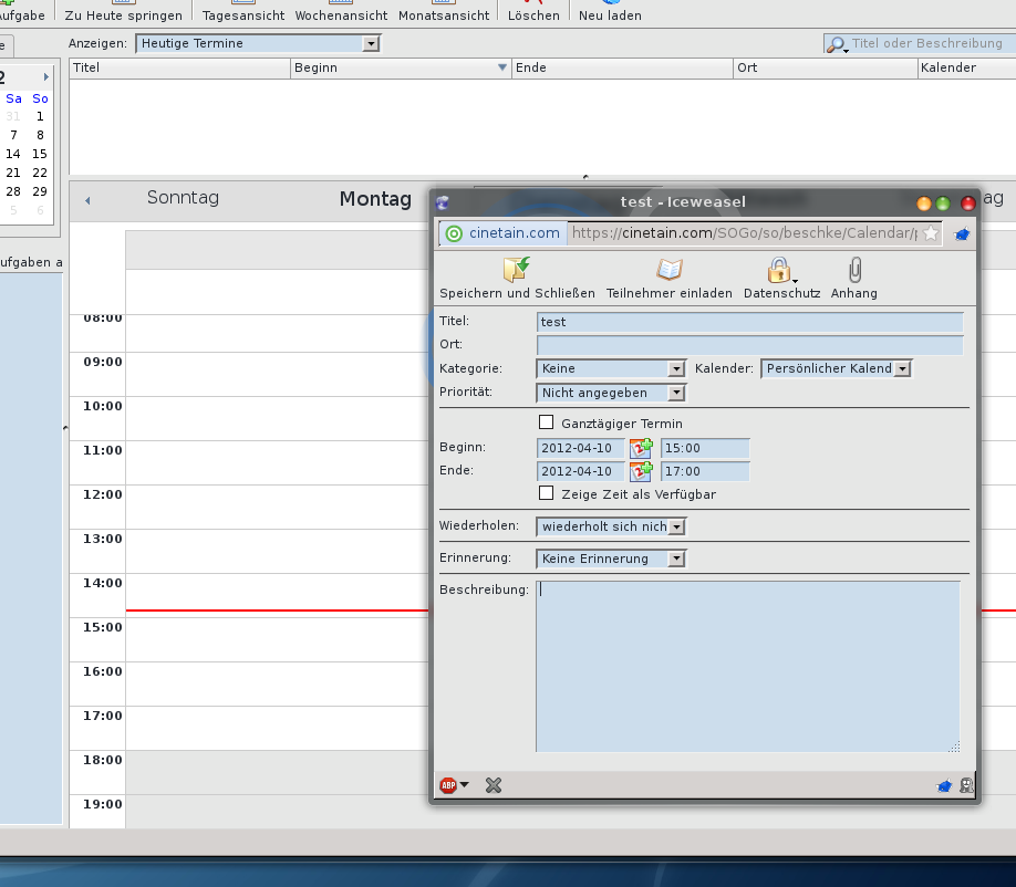 as you see on the pictures. The time is set correctly, the red line is nearly at 15:00 (3PM) - So, SOGo knows the correct time and timezone. now I create an event as shown in the first screenshot: 3-5 PM, so after saving, the new event should appear directly under the red line. Actually it doesn't. The new event is saved with a timeshift - 2 hours back - starting at 1 PM instead of 3 PM It must be a bug in the saving mechanismn, as now the time-shifted event also appears time shifted on devices connected via CalDAV. (mobile phones etc.) I can modify the event with the mobile phone or via thunderbird to let it start at 3 PM. This works fine. But in the Web Interface, the event always appears 2 hours back... (e.g. if I move it starting at 5PM - on all CalDAV devices everything is fine, but in the web-interface it shows the event at 3PM. |
