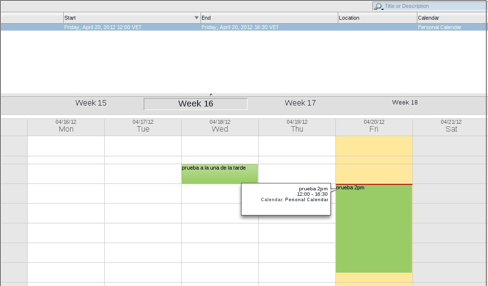 as the file screen.jpg [^] (44,079 bytes) 2012-04-20 12:32 shows an event which ICS file: BEGIN:VCALENDAR this is also SOGo 1.3.14 on Debian 6.0.4 (32 bit), installed from the packages at the inverse.ca repository oddly enough, same version of SOGo on the same version of Debian on another installation (different customer) is working properly both are virtualized the one that fails is under vmware and the one that works is inside an openvz container, I don't think if has anything to do with it, but it's a difference Carlos Maldonado |