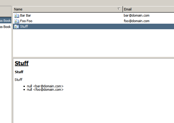 | Description | If you create a contact-list from web gui, add some members and then save, when you display the list, the name of the members are shown as null (see attachment): . null <foo@domain.com> and on psql the list is stored as: BEGIN:VLIST\r this happens in your demo too. Bye | ||||