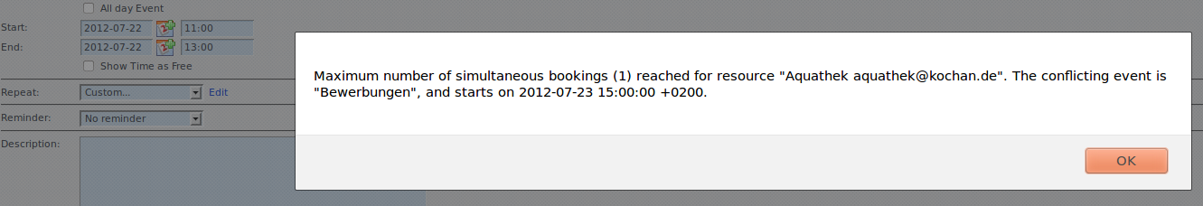 | Description | I try to create an event on sunday the 22.07.12,11:00-13:00, add the ressource, and it accepts correctly. If I try to make the event reccuring (on creation or after just trying to modify it), it complaints, even if the times actually do not overlap at all: | ||||