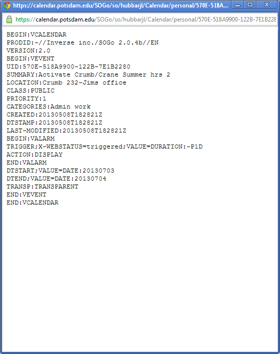 | Additional Information | DTSATRT;VALUE=DATE:20130703 TRIGGER;X-WEBSTATUS=triggered;VALUE=DURATION:-P1D | ||||