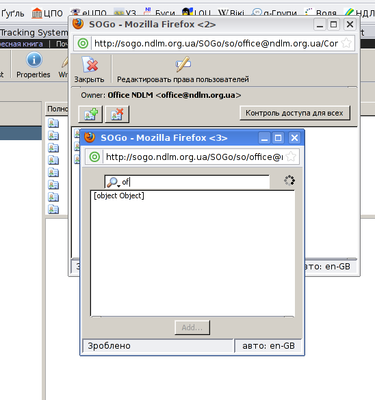 | Description | After SOGo upgrade to 1.1.0 found a bug: there's error while trying to select persons for shared objects: calendar or address book, every time I'm clicking on lens icon I got [object Object] response. | ||||