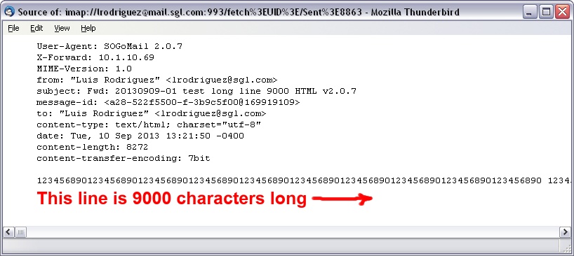 | Description | When using HTML format I notice the body of the message (without attachments) is coded in one single line. Some mail servers bounce the message when the line is too long (after tests I found messages bounced when the line is above 8187 characters more or less) The log looks like this: If I send the same message through Thunderbird the body is coded in several Is there a way to set up SOGo to break the message body in several lines? | ||||