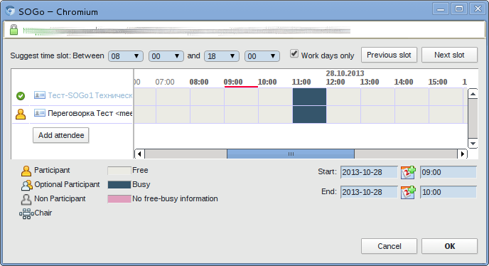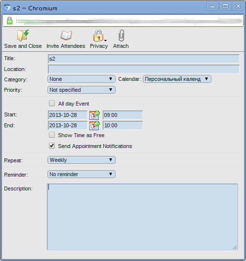 | Description | Today is 24.10.2013. Our TZ is Europe/Kiev and we'll have daylight saving time shift 27.10.2013 04:00 from +3 to +2. I create weekly event 28.10.2013 (after the shift) 10:00-11:00, invite meetingroom.