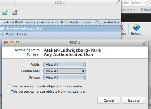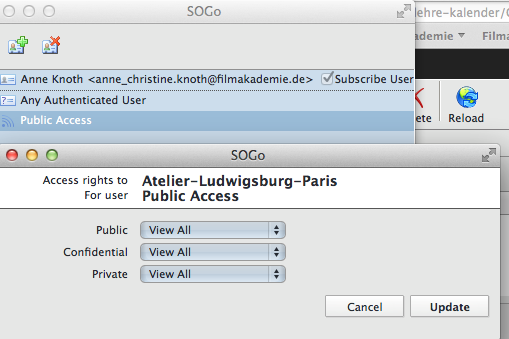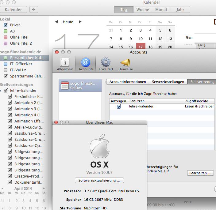 | Description | An user has created a calendar (Sperrtermine) in SOGo and set all r/w access to it for my user. He subscribed me to that calendar and I see it in SOGo and I can add/edit entries. With OS X 10.9 and my configured CalDav Account all SOGo Calendar show up in the calendar list. But when I check the "Stellvertreter" in the preferences of Apple Kalender, ALL calendars of the user are subscribed in the Calendar List. Thous I don't have special ACL rights to. | ||||
