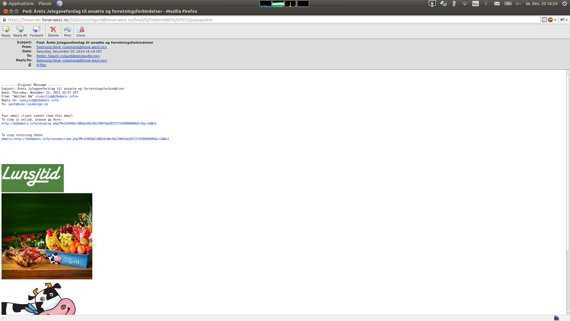 <NGMimeMessage[0x0x7fed08c6ccd0]: header={"content-disposition" = "<NGMimeContentDispositionHeaderField[0x0x7fed08c6c1d0]: type=inline>"; "content-type" = "<NGMimeType: multipart/related; type=\"multipart/alternative\"; boundary=b1_17c24ad2d8bea1fada25d8552d4b0cec; charset=UTF-8>"; date = "2012-11-22 08:57:31 -0600"; "dkim-signature" = "v=1; a=rsa-sha256; q=dns/txt; c=relaxed/relaxed; d=b2bdeals.info; s=default;h=Content-Transfer-Encoding:Content-Type:List-Unsubscribe:MIME-Version:Reply-To:From:Date:Message-ID:Subject:To; bh=CmsMh7U6LtR3nnGRpGqgiRqgHP098Zae4lfYh8LYpVs=;b=nBUQC4OFm0k0ZcskJ7KxC53kG0fMysYBgSqStN3/K+tYCJhUsq4iGCimtE3ci8G4PTdVcxWKoO3+zBo8hGVpDk9G1laavGmrmsSZ4vU016/udJo1w41jkE1DO516s1NV3bml6U8RiQERoM85xzcXgqxWCpfLVXHuRVdWBSWLDOo=;"; from = "\"Walther B\U00F8\" <lunsjtid@b2bdeals.info>"; "list-unsubscribe" = "<http://b2bdeals.info/unsubscribe.php?M=15945&C=882dc0dc9d1f00fda203727418909689&L=1&N=2>"; "message-id" = "<fc4326028c7099c9b7721768f191210c@b2bdeals.info>"; "mime-version" = "1.0"; received = ("from mta1e-out.mail.zscaler.net ([95.172.88.23]) by hove-lysdesign.no with Microsoft SMTPSVC(6.0.3790.4675); Thu, 22 Nov 2012 23:31:56 +0100", "from smtp1.b2bdeals.info ([216.114.67.65])by mta1e.mail.zscaler.net ([95.172.88.18])with ESMTP id 50AEA7DB110C000D;Thu, 22 Nov 2012 14:31:55 -0800"); "reply-to" = "lunsjtid@b2bdeals.info"; "return-path" = "bounce2@b2bdeals.info"; subject = "\U00C5rets Julegaveforslag til ansatte og forretningsforbindelser"; to = "post@hove-lysdesign.no"; "x-mailer-lid" = 1; "x-mailer-recptid" = 15945; "x-mailer-sent-by" = 1; "x-mailer-sid" = 2; "x-originalarrivaltime" = "22 Nov 2012 22:31:56.0695 (UTC) FILETIME=[2DF76270:01CDC901]"; "x-php-originating-script" = "48:email.php"; "x-zscaler" = "score=0 iprep=0 v=2.0 cv=LNbRtuq9 c=1 sm=2 a=VwQV3CfmW/wAiSmHSJnNzg==:17 a=TQig9nyLG3MA:10 a=0rsfSqTdmtsA:10 a=jPJDawAOAc8A:10 a=f125mT680E0A:10 a=lC8uKkGJAAAA:8 a=LRac_gl731MA:10 a=E5RIb2eFuxHTFJJcCXgA:9 a=QEXdDO2ut3YA:10 a=vUfrJpr6CM0A:10 a=yC6AvgWgkjgA:10 a=Ye8d2JQ513UA:10 a=NWVoK91CQyQA:10 a=Tk7SfkanmV3tOK424dgA:9 a=tXsnliwV7b4A:10 a=O0QuTOOqc30A:10 a=GEUbSft7xdoA:10 a=iTjQwLxq-CBjfwrz:21 a=XFezxwGAa2Im7ESOOhUA:9 a=1VqFK4TplAA:10 a=phB83tPY2mq9E6Hg:18 a=C14PwEFZ01VakhZ4QMUA:9 a=KQqxNPgzF0kA:10 a=m86Xan-EPKNR-MlX:18 a=tGNOyam75cCqjoyJu00A:9 a=NksRCJ-fSQeqibLe:21 a=Imol6v92Ayb1SMJF:21 a=6c5tpbTlHzeSPVou:18 a=NsOwj-WIYB4TTJnvEdsA:9 a=F9kThLbQiYnuAuu:18 a=VwQV3CfmW/wAiSmHSJnNzg==:117"; } body=<NGMimeMultipartBody[0x0x7fed08c67db0]: suffix=