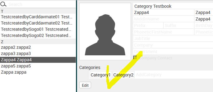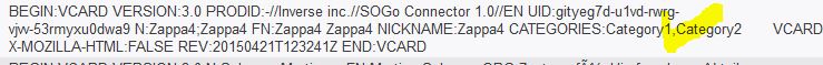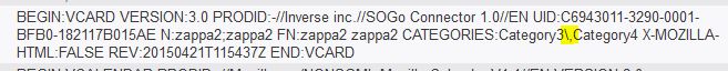 | Description | When i try to add categories to an address book entry the SOGo Connector adds a backslash at the end of every category. Under SOGo and Thunderbird address-book this seems no problem, but when open such an entry with (the great!!!) CardDavMATE (https://www.inf-it.com/open-source/clients/carddavmate/) then the Categories are not seperated - they looks like as one. I´m using the latest Version of Davical 1.1.3.1 under Ubuntu Linux 14.04.1 as Caldav/Carddav Server. Strangly this problem only shows up when the vcard entry was initially made under Thunderbird/Sogo - when I make a new vcard with CardDavMATE and then add categories with Thunderbird/Sogo the there is no Problem and no wrong backlashes... | ||||