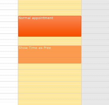 | Description | Some of ours users wish a better overview between appointments they marked as "Show Time as Free" and those they didn't. This makes finding available time slots easier for busy users. A proposal was making those appointments semi-transparent, ie. an opacity of 50%. | ||||