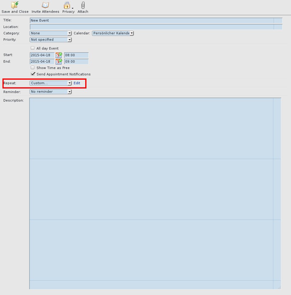 | Description | Custom recurrence rules are not immediately visible in the event edit window, but the recurrence edit window must be opened. At least the "category" should be indicated, ie. daily/weekly/... | ||||