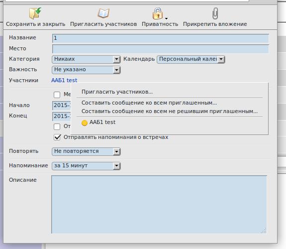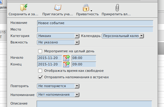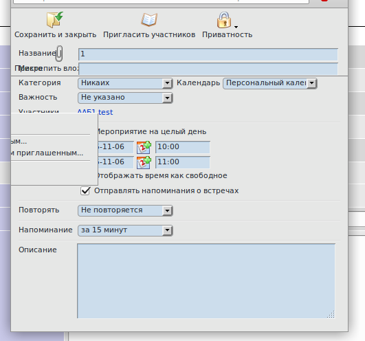 | Description | Calendar event dialog is broken on Linux with Firefox, you can see it at screenshot. A workaround is to resize window - make it wider. But the size is reseted every time it's opened. Reproducible with ubuntu,xubuntu,fedora default installations. Windows is ok It seems it's fonts+language issue. A fix could be increasing default dialog window size. | ||||