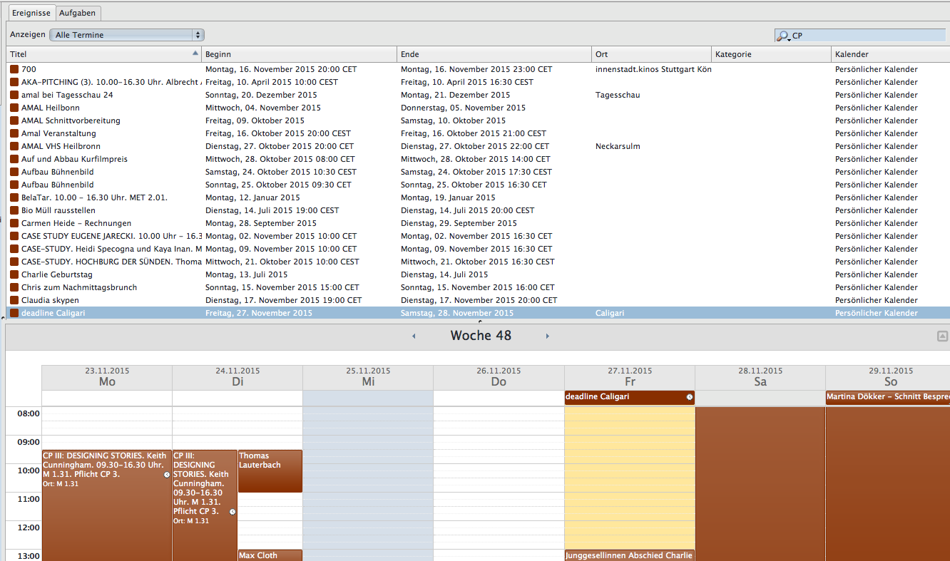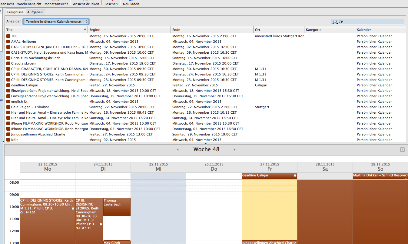 | Description | Hi, in safari os x 10.8 i have problems with the search and overview. See the attached screenshots. Show this month: E.G. i have Events with the title "CP III ...." If I search for CP still all events show up. Show all events: The "CP III ...." events don't show up in the list, but in the weekly view. | ||||