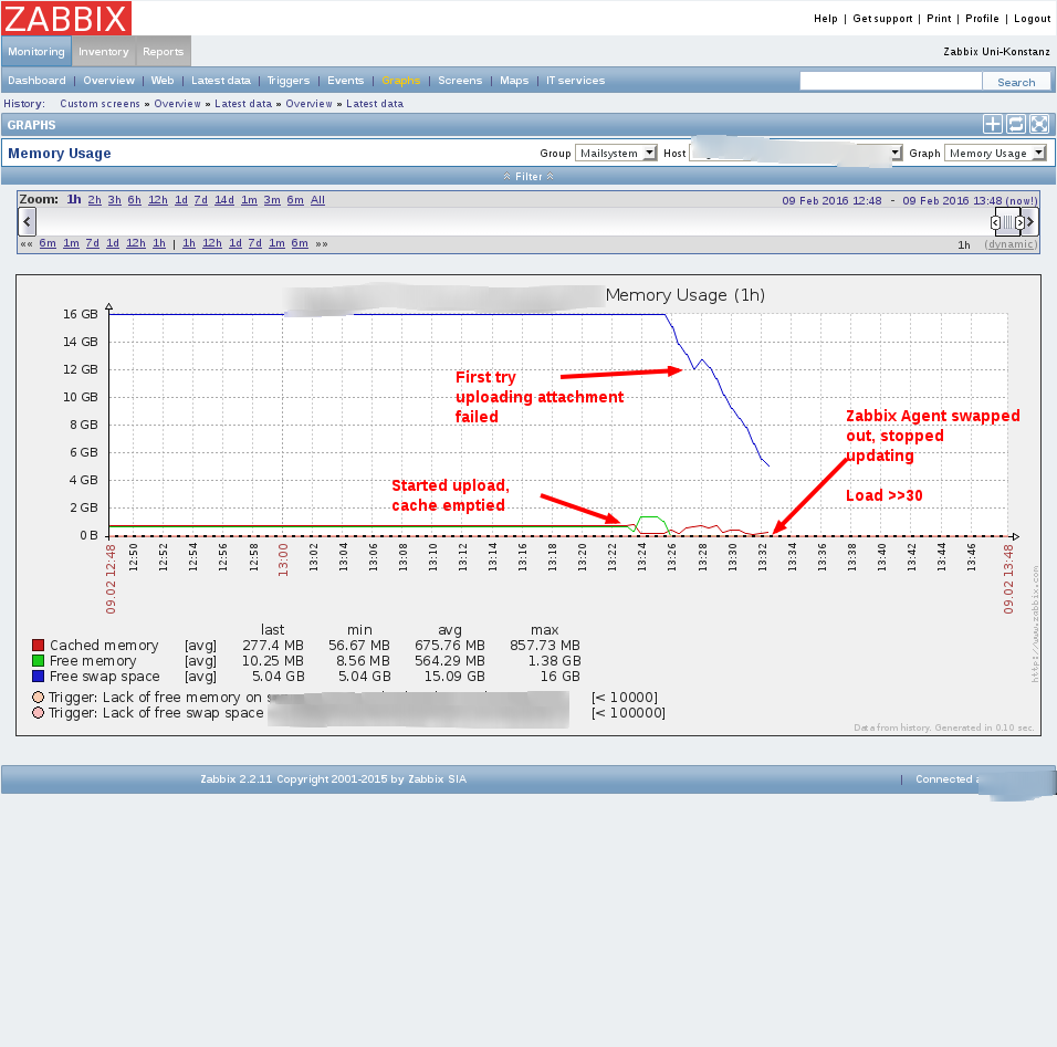 I reproduced the issue -- uploading a single 1GB file. I uploaded a log excerpt starting from the time I uploaded the attachment. Interestingly, one process after the other gets occupied and dies after some time -- without the attachment being uploaded again. I'm sorry I forgot to put timestamps near the top outputs, but they're chosen at arbitrary times anyway (not related to any special events in the log). At least they are in order, and one can correlate what's going on using the process IDs. |