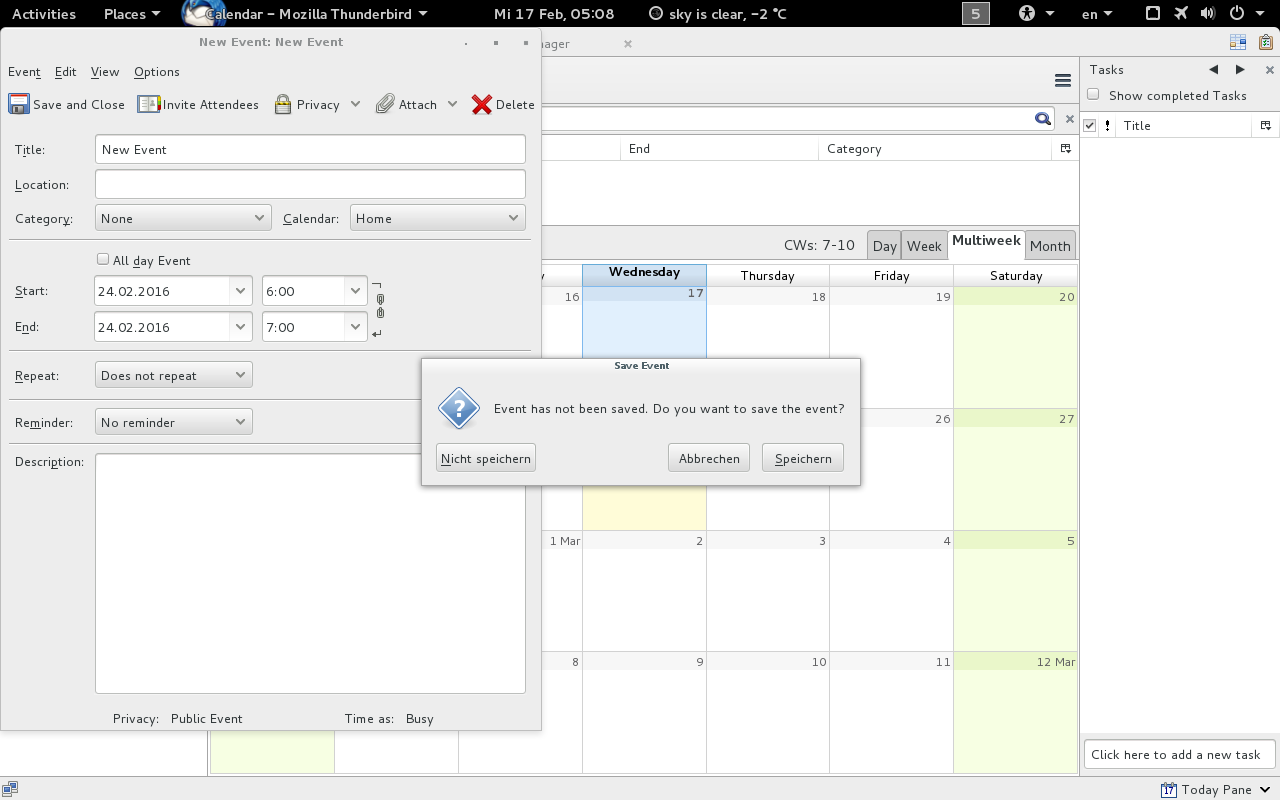 | Description | With active SOGo Connector addon, an unexpected confirmation dialog appears when creating an event or task in Thunderbird/Lightning and closing it immediately without any modifications. This dialog does not appear when SOGo Connector addon is not active. | ||||