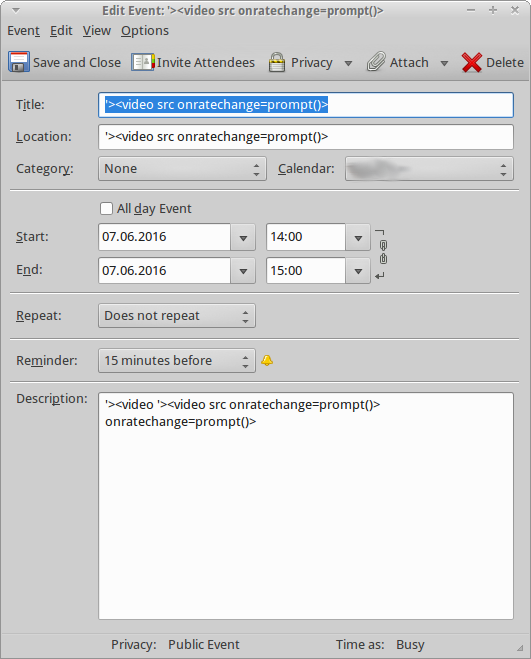 | Summary | 0003718: Persistent Cross-Site Scripting in calendar | ||||