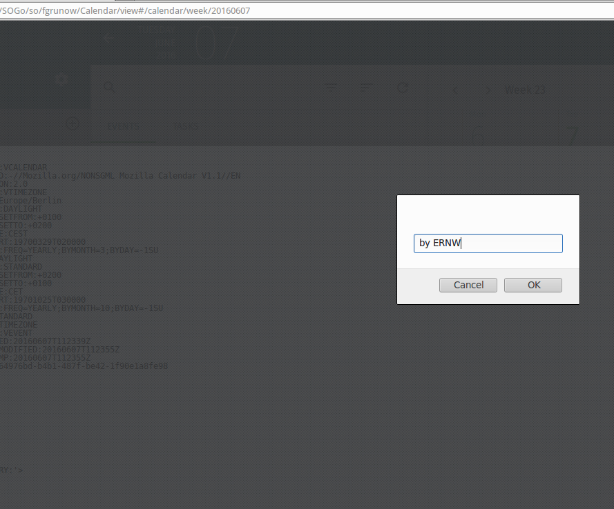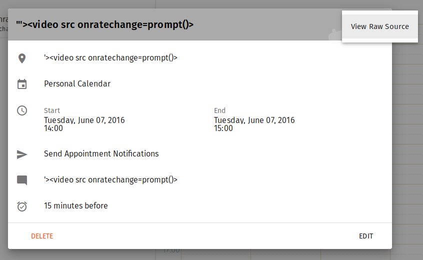 | Steps To Reproduce | 1) Create a calendar entry like the one attached in the screenshot below. I used thunderbird for this, XSS might also trigger if you do this in SOGo diretly. Did not try. 2) View the entry in SOGo. Click on "View Raw Source". 3) JavaScript payload will be executed in the browser. | ||||