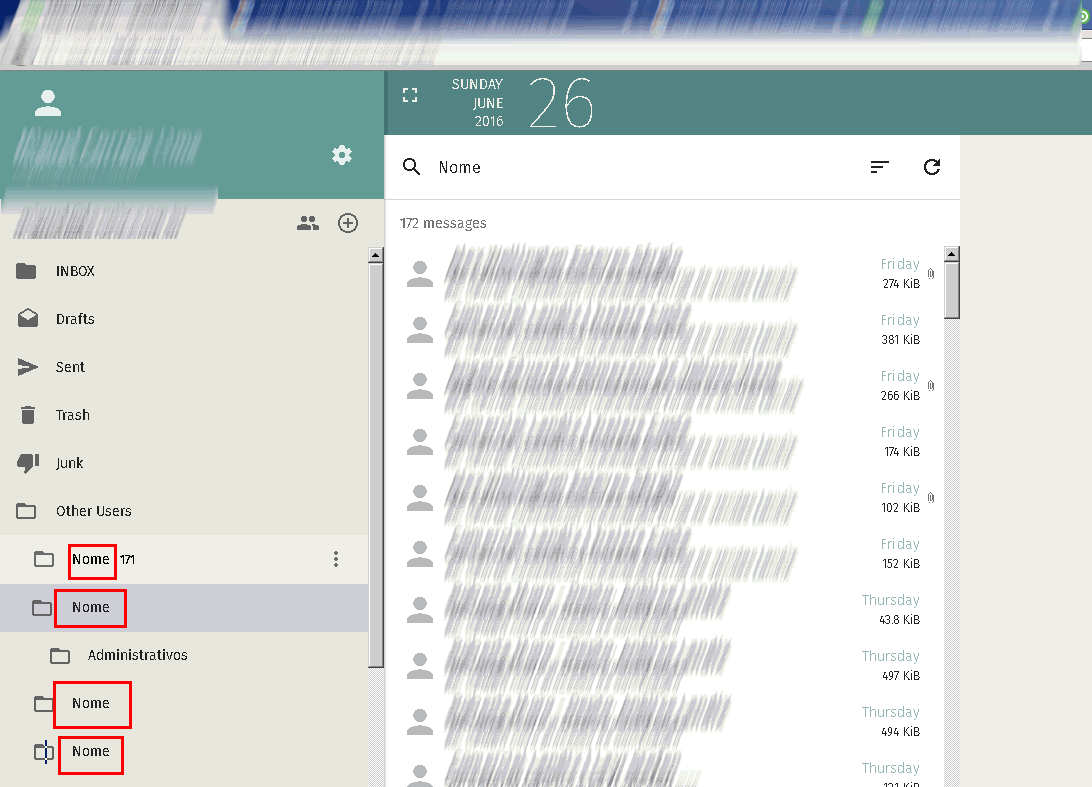 | Description | Sogo Webmail using Cyrus Imap show "Nome" at top level of each "Other Users" subfolder. Firefox browser 47.0 client In other words, the name of "Other User" subfolther ( the user name ) are showed as a string "Nome" to all user names. The "Other Users" subfolder are showed correct. Please, see a attached picture. | ||||