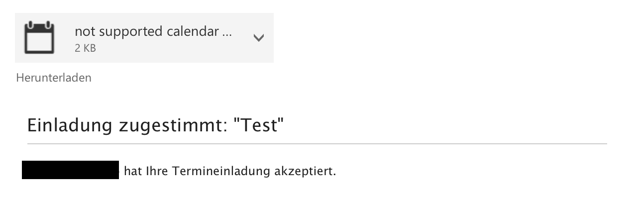 User (Exchange 2013/2016) sends an invitation (from Outlook 2016 or from OWA), attendee is on SOGo 3.1.3. Attendee accepts invitation in SOGo's web interface. Organizer gets acceptance mail, but with an attachment "unsupported calendar message.ics". As long as he does not open this attachment, the appointment will not be updated with attendee status. Most users are afraid to open this attachment.