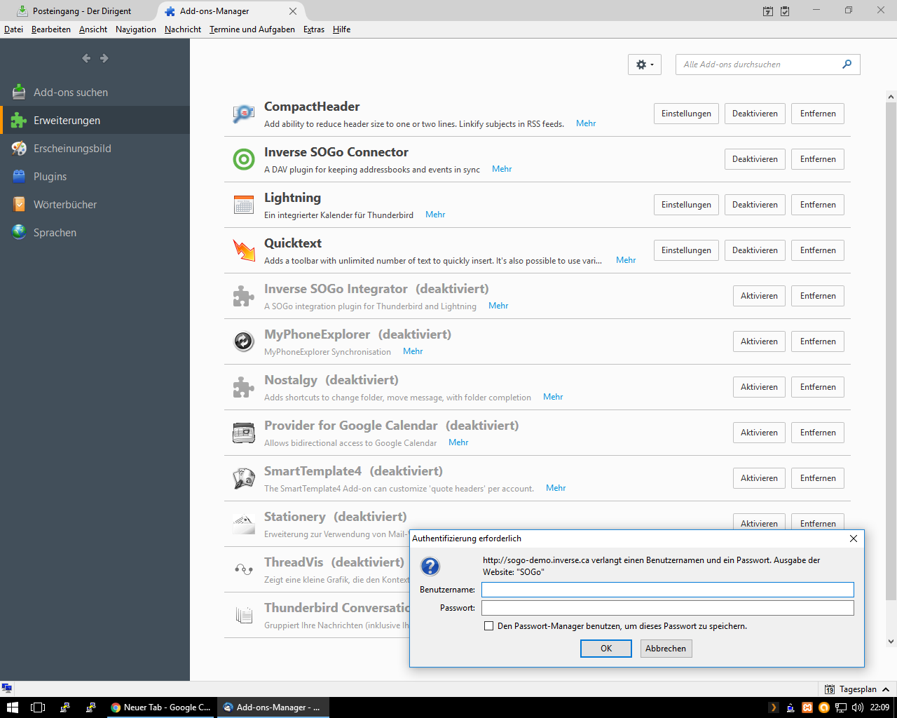 And you obviously installed the SOGo Integrator extension WITHOUT customizing it. Since it asks you for a password on sogo-demo.inverse.ca. |