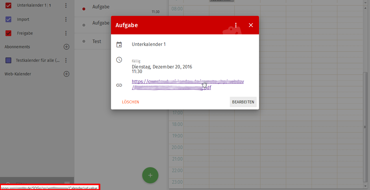 | Description | If users create an attachment for a task, the attachment is always reffering to /SOGo/so/user/Calendar/url.value, which results in an error message: An error occurred during object publishing the requested object could not be found! I tried this with owncloud, dropbox and public files. | ||||