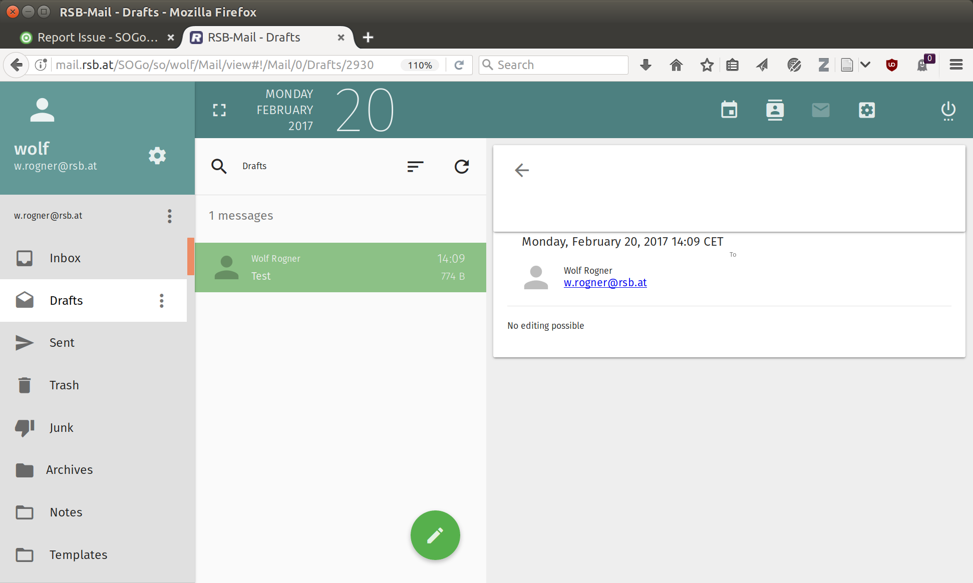 | Description | After yesterdays upgrade, editing or sending Mail stored in the draft folder is no possible any more | ||||