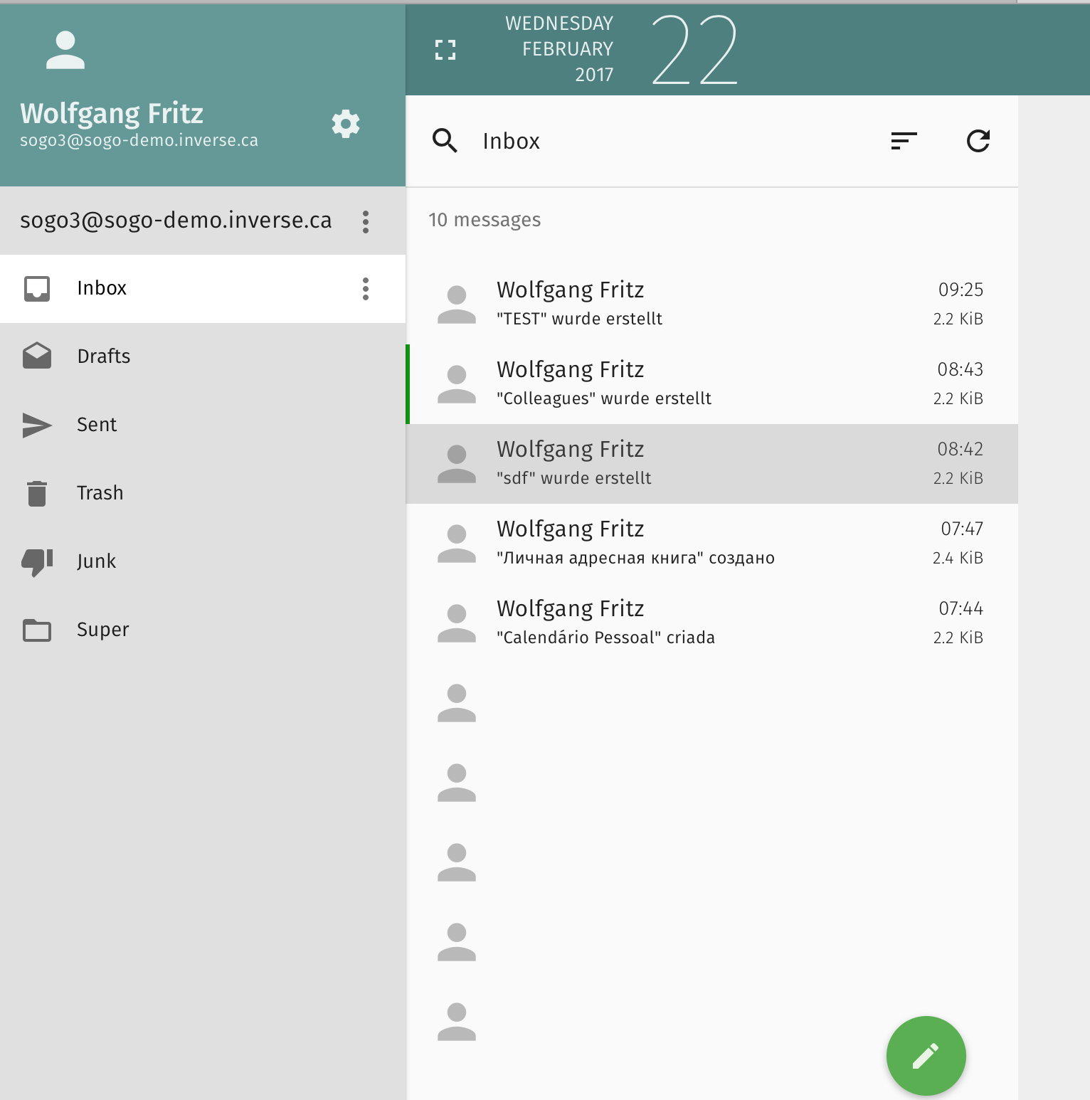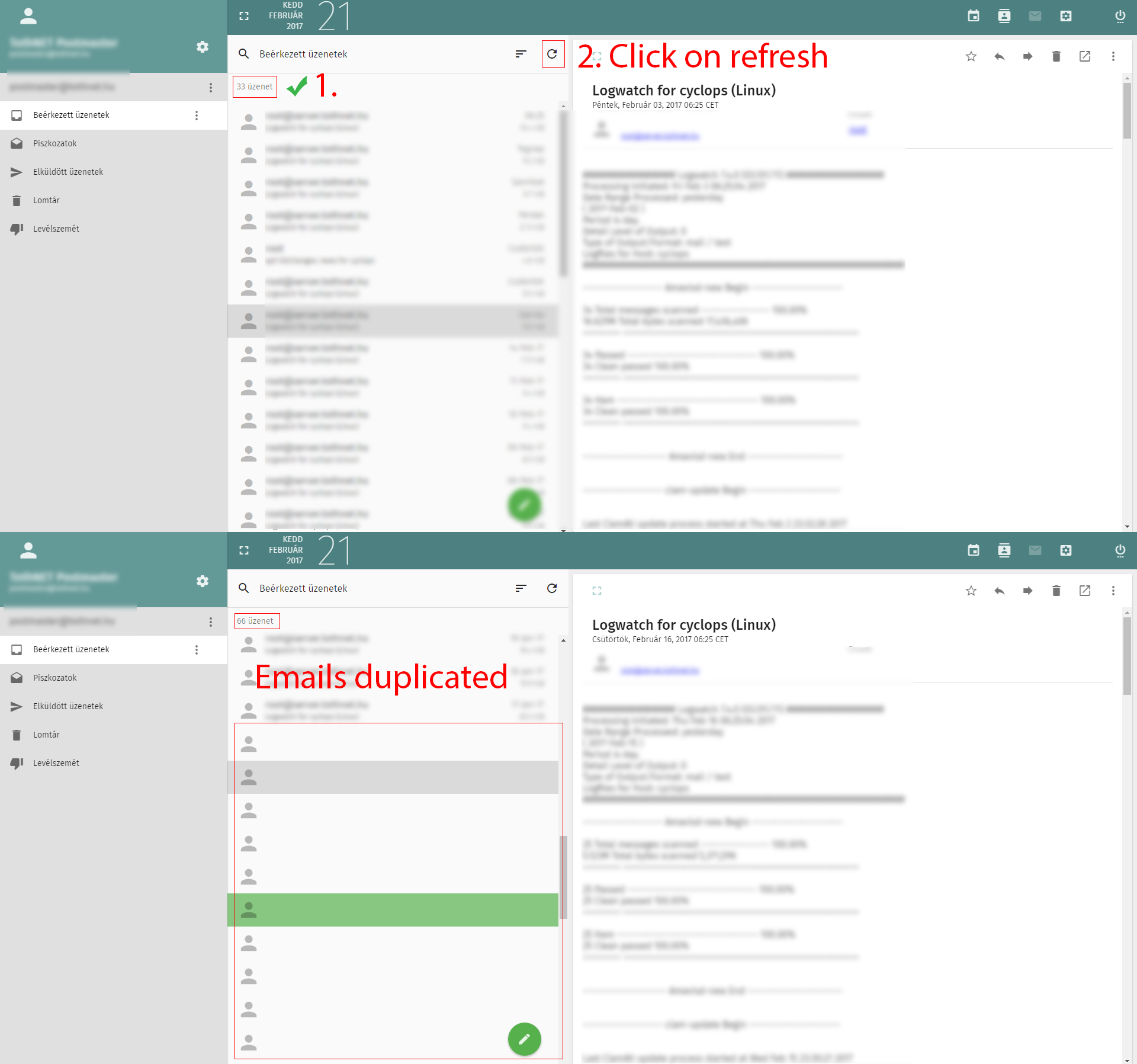 | Description | In webui SOGo duplicates emails on EVERY refresh. (It doesnt matter if automatic or manual refresh occured.) The duplicated mails doesn't have any info (subject/sender/date) but on click it opens in viewer. | ||||