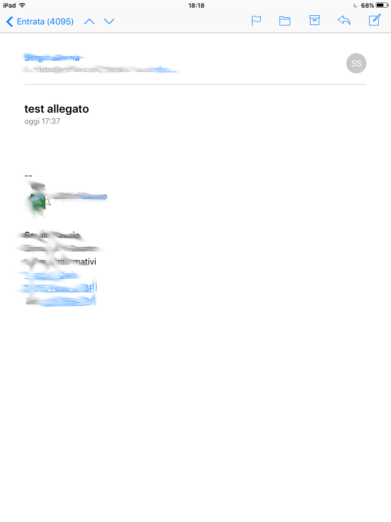 messages are sent from SOGo web mail messages are read (on iPad) via default mail client connected in imap to a google account the recipient ISP doesn't affect the result: everytime I send an email from SOGo web mail with the embedded html signature and an attachment, the recipient can't see the attachment in his mail client on IOS (tried on iPad, iPhone ecc.. many free isp like google or libero.it) the same email, viewed on a different client (outlook via imap, TB via imap or on remote webmail) has no issues.. but an identical email (same embedded html email, same attachment, same text), sent from roundcube from the same server to the same recipient doesn't show any issue.. signature and attach are both visible |