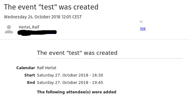 | Description | Attendees of an event which are not in one of the users addressbooks or if no name of the attendee is set, are not shown in the event creation info mail. | ||||
