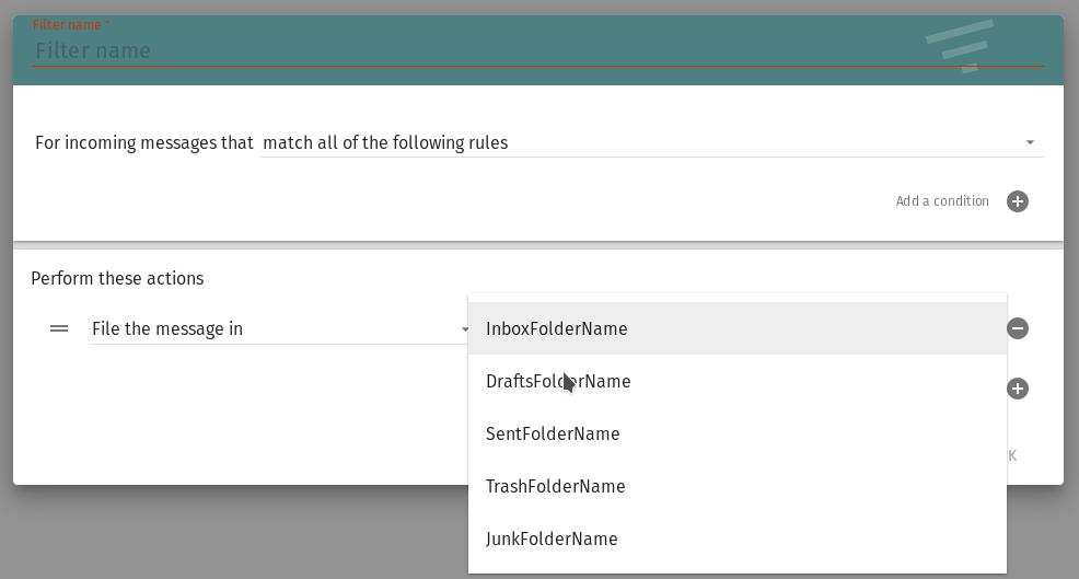 | Description | When creating a new mail filter with action "File the message in" the folder names shown in the "Mailbox" drop down box are wrong/untranslated, for example "InboxFolderName". See attached screenshot. | ||||