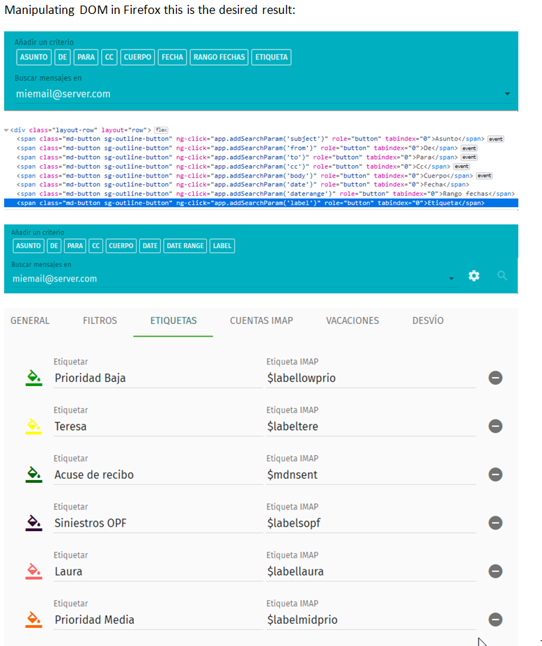 | Description | In WebUI, when you're searching inside body for an applied user defined label (label name or imap variable (defined in settings->email->label) ); even using regexp; there is no available results. Sum in it, those are the features requested: Search by label (name), by date or range between dates. | ||||