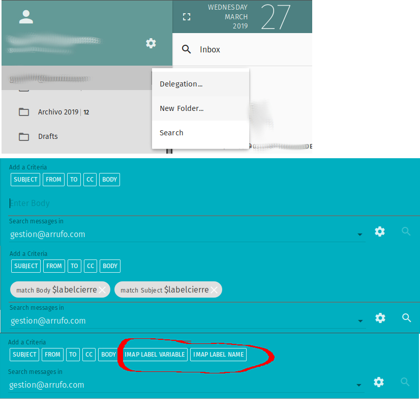 | Description | Search by IMAP Label can't return any results due to an unsupported or inexistent function I think. I tried many ways to search even using regular expressions, but the thing is that normal users (people working inside the office) never will be experts users or programmers, and they can't search by IMAP Label in easy way. I've attached a screenshot reproducing the issue. | ||||