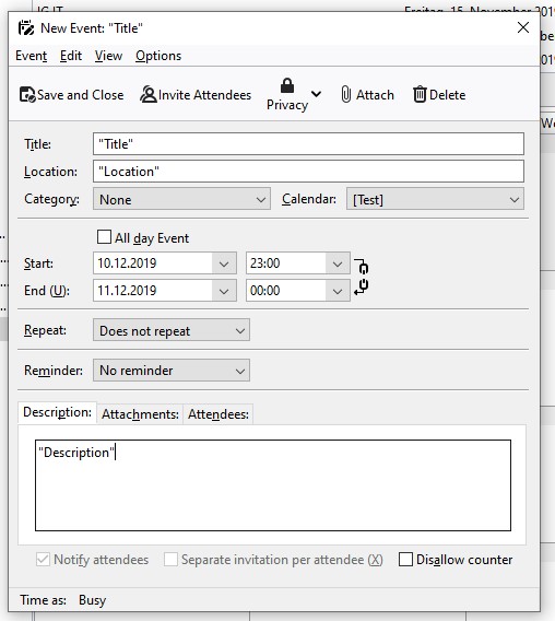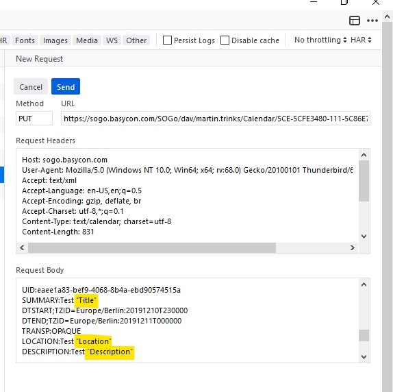 | Description | Adding or changing an event via client (e.g. Thunderbird with SOGo Connector or TbSync), quotations marks are removed from text fields (title, location, description). | ||||