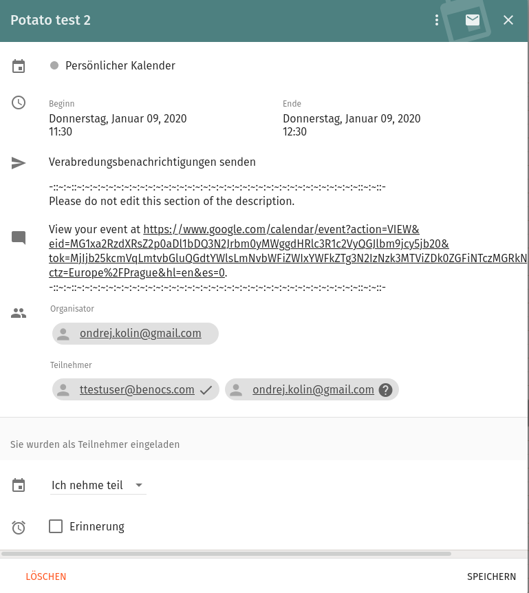 BEGIN:VCALENDAR PRODID:-//Google Inc//Google Calendar 70.9054//EN VERSION:2.0 CALSCALE:GREGORIAN METHOD:REQUEST BEGIN:VEVENT DTSTART:20191218T180000Z DTEND:20191218T190000Z DTSTAMP:20191218T131928Z ORGANIZER;CN=user@gmail.com:mailto:user@gmail.com UID:713haqbaogerehvc44pqpu2jbs@google.com ATTENDEE;CUTYPE=INDIVIDUAL;ROLE=REQ-PARTICIPANT;PARTSTAT=ACCEPTED;RSVP=TRUE ;CN=user@gmail.com;X-NUM-GUESTS=0:mailto:user@gma il.com ATTENDEE;CUTYPE=INDIVIDUAL;ROLE=REQ-PARTICIPANT;PARTSTAT=NEEDS-ACTION;RSVP= TRUE;CN=local_sogo@benocs.com;X-NUM-GUESTS=0:mailto:local_sogo@benocs.com X-MICROSOFT-CDO-OWNERAPPTID:1676626213 CREATED:20191218T131922Z DESCRIPTION:-::~:~::~:~:~:~:~:~:~:~:~:~:~:~:~:~:~:~:~:~:~:~:~:~:~:~:~:~:~:~ :~:~:~:~:~:~:~:~::~:~::-\nDiesen Abschnitt der Beschreibung nicht bearbeite n.\n\nZeigen Sie Ihren Termin unter https://www.google.com/calendar/event?a ction=VIEW&eid=NzEzaGFxYmFvZ2VyZWh2YzQ0cHFwdTJqYnMgc3NjaHJvZWRlckBiZW5vY3Mu Y29t&tok=Mjcjc3RlcGhhbi5zY2hyb2VkZXJAZ21haWwuY29tZjdjYjlmY2U1Njk2NTQwYTJjZT kxMmFkMGRhMWM4MjIyOGE1ZmY3Mg&ctz=Europe%2FBerlin&hl=de&es=1 an.\n-::~:~::~: ~:~:~:~:~:~:~:~:~:~:~:~:~:~:~:~:~:~:~:~:~:~:~:~:~:~:~:~:~:~:~:~:~:~:~::~:~: :- LAST-MODIFIED:20191218T131922Z LOCATION: SEQUENCE:0 STATUS:CONFIRMED SUMMARY:Test 8 accept in mobile 21min TRANSP:OPAQUE END:VEVENT END:VCALENDAR |