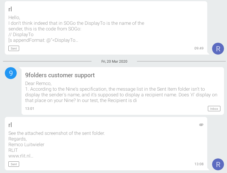 See the attached screenshot from my email conversation with support from Nine, it displays rl where it should display Remco Luitwieler. According to Nine support this caused by the wrong DisplayTo field, although i think this is not the DisplayTo, because i am rl and therefore not the To, but the From. Nevertheless, i opened this ticket because Nine support asked me to. |