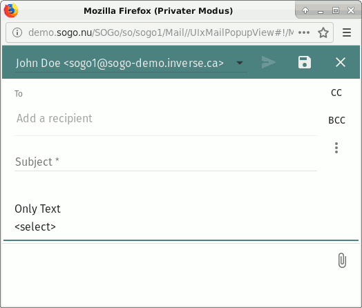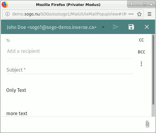 | Description | We compose e-mails with Firefox and SOGo in a new window as text e-mails. As soon as I use some HTML tags like <textarea>, <select> or <noscript>, the body area of the e-mail window collapses and the upload area is enlarged. If I remove the ">" the area looks normal again. If I use the HTML editor, the tags are not rendered (as expected). But with plain text e-mails the tags would not have to be rendered at all! | ||||