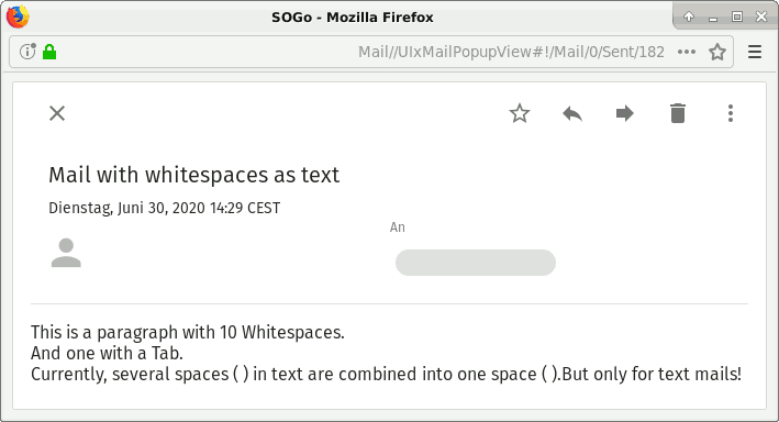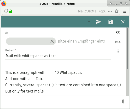| Description | We write e-mails as plain text. If I use multiple spaces for text formatting, they are combined into one space before sending. Unfortunately, this way the formatting is lost. Tabs are also replaced by one space (I don't know if tabs are allowed in plain text emails). | ||||
