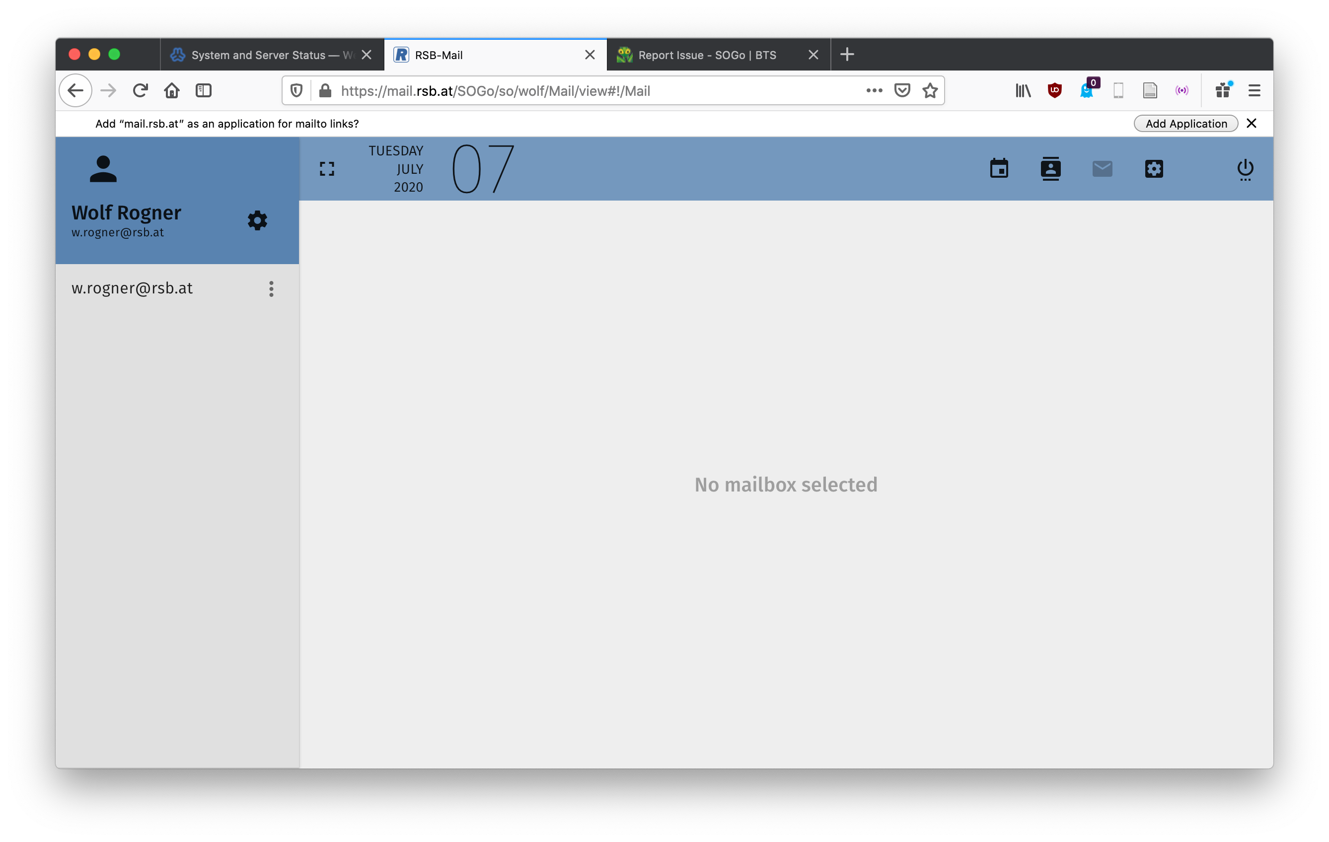 | Description | After login, the mailbox view is empty (except for "No mailbox selected"). This issue occured right after the update on 6th July 2020 (4.3.2.20200706-1) | ||||