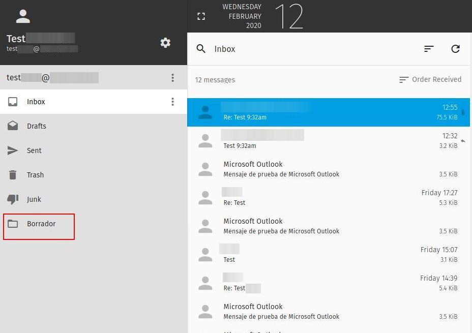 In the options on the left of the panel, the following options are shown in English, "inbox", "Drafts", "Sent", "Trash", "Junk". But the "Draft" option is displayed in Spanish "Borrador".