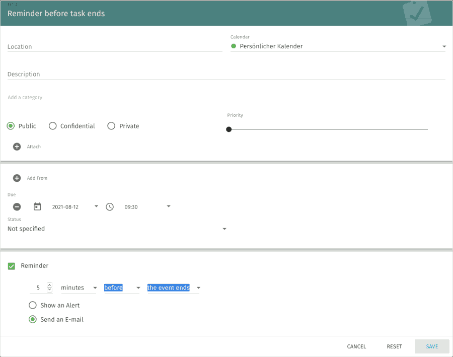 | Description | When I create an event (or task with a due date) and set it with an end of event reminder via email, it is not sent. Reminders by alarm or also by e-mail at the beginning of the event are working. I hope it is only a small thing and can be fixed quickly so that no more reminders are forgotten. | ||||