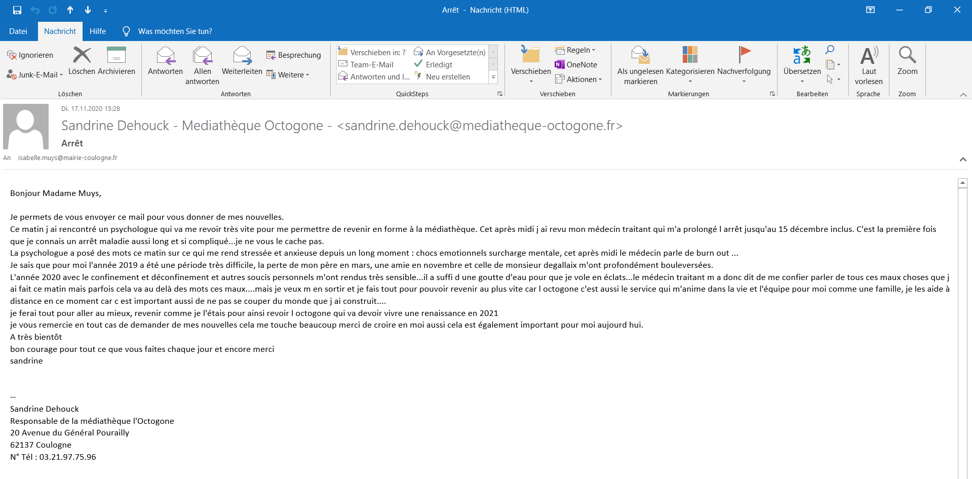 From: =?utf-8?q?Sandrine_Dehouck_-_Mediath=C3=A8que_Octogone_-?= <sandrine.dehouck@mediatheque-octogone.fr> To: isabelle.muys@mairie-coulogne.fr User-Agent: SOGoMail 5.0.1 MIME-Version: 1.0 Date: Tue, 17 Nov 2020 15:28:13 +0100 Subject: =?utf-8?q?Arr=C3=AAt?= Message-ID: <7036-5fb3de00-1-3a014700@100109727> X-Forward: 88.123.83.28 Content-Type: multipart/alternative; boundary="----=_=-_OpenGroupware_org_NGMime-28726-1605623293.364857-0------" ------=_=-_OpenGroupware_org_NGMime-28726-1605623293.364857-0------ Content-Type: text/plain; charset=utf-8 Content-Transfer-Encoding: quoted-printable Content-Length: 2211 Bonjour Madame Muys, Je permets de vous envoyer ce mail pour vous donner de mes nouvelles. Ce matin j ai rencontr=C3=A9 un psychologue qui va me revoir tr=C3=A8s = vite pour me permettre de revenir en forme =C3=A0 la m=C3=A9diath=C3=A8= que. Cet apr=C3=A8s midi j ai revu mon m=C3=A9decin traitant qui m'a pr= olong=C3=A9 l arr=C3=AAt jusqu'au 15 d=C3=A9cembre inclus. C'est la pre= mi=C3=A8re fois que je connais un arr=C3=AAt maladie aussi long et si c= ompliqu=C3=A9...je ne vous le cache pas. La psychologue a pos=C3=A9 des mots ce matin sur ce qui me rend stress=C3= =A9e et anxieuse depuis un long moment : chocs emotionnels surcharge me= ntale, cet apr=C3=A8s midi le m=C3=A9decin parle de burn out ... Je sais que pour moi l'ann=C3=A9e 2019 a =C3=A9t=C3=A9 une p=C3=A9riode= tr=C3=A8s difficile, la perte de mon p=C3=A8re en mars, une amie en no= vembre et celle de monsieur degallaix m'ont profond=C3=A9ment boulevers= =C3=A9es. L'ann=C3=A9e 2020 avec le confinement et d=C3=A9confinement et autres s= oucis personnels m'ont rendus tr=C3=A8s sensible...il a suffi d une gou= tte d'eau pour que je vole en =C3=A9clats...le m=C3=A9decin traitant m = a donc dit de me confier parler de tous ces maux choses que j ai fait c= e matin mais parfois cela va au del=C3=A0 des mots ces maux....mais je = veux m en sortir et je fais tout pour pouvoir revenir au plus vite car = l octogone c'est aussi le service qui m'anime dans la vie et l'=C3=A9qu= ipe pour moi comme une famille, je les aide =C3=A0 distance en ce momen= t car c est important aussi de ne pas se couper du monde que j ai const= ruit.... je ferai tout pour aller au mieux, revenir comme je l'=C3=A9tais pour a= insi revoir l octogone qui va devoir vivre une renaissance en 2021 je vous remercie en tout cas de demander de mes nouvelles cela me touch= e beaucoup merci de croire en moi aussi cela est =C3=A9galement importa= nt pour moi aujourd hui. A tr=C3=A8s bient=C3=B4t bon courage pour tout ce que vous faites chaque jour et encore merci sandrine --=C2=A0 Sandrine Dehouck Responsable de la m=C3=A9diath=C3=A8que l'Octogone 20 Avenue du G=C3=A9n=C3=A9ral Pourailly 62137 Coulogne N=C2=B0 T=C3=A9l : 03.21.97.75.96 ------=_=-_OpenGroupware_org_NGMime-28726-1605623293.364857-0------ Content-Type: text/html; charset=utf-8 Content-Transfer-Encoding: quoted-printable Content-Length: 2345 <html>Bonjour Madame Muys,<br /><br />Je permets de vous envoyer ce mai= l pour vous donner de mes nouvelles.<br />Ce matin j ai rencontr=C3=A9 = un psychologue qui va me revoir tr=C3=A8s vite pour me permettre de rev= enir en forme =C3=A0 la m=C3=A9diath=C3=A8que. Cet apr=C3=A8s midi j ai= revu mon m=C3=A9decin traitant qui m'a prolong=C3=A9 l arr=C3=AAt jusq= u'au 15 d=C3=A9cembre inclus. C'est la premi=C3=A8re fois que je connai= s un arr=C3=AAt maladie aussi long et si compliqu=C3=A9...je ne vous le= cache pas.<br />La psychologue a pos=C3=A9 des mots ce matin sur ce qu= i me rend stress=C3=A9e et anxieuse depuis un long moment : chocs emoti= onnels surcharge mentale, cet apr=C3=A8s midi le m=C3=A9decin parle de = burn out ...<br />Je sais que pour moi l'ann=C3=A9e 2019 a =C3=A9t=C3=A9= une p=C3=A9riode tr=C3=A8s difficile, la perte de mon p=C3=A8re en mar= s, une amie en novembre et celle de monsieur degallaix m'ont profond=C3= =A9ment boulevers=C3=A9es.<br />L'ann=C3=A9e 2020 avec le confinement e= t d=C3=A9confinement et autres soucis personnels m'ont rendus tr=C3=A8s= sensible...il a suffi d une goutte d'eau pour que je vole en =C3=A9cla= ts...le m=C3=A9decin traitant m a donc dit de me confier parler de tous= ces maux choses que j ai fait ce matin mais parfois cela va au del=C3=A0= des mots ces maux....mais je veux m en sortir et je fais tout pour pou= voir revenir au plus vite car l octogone c'est aussi le service qui m'a= nime dans la vie et l'=C3=A9quipe pour moi comme une famille, je les ai= de =C3=A0 distance en ce moment car c est important aussi de ne pas se = couper du monde que j ai construit....<br />je ferai tout pour aller au= mieux, revenir comme je l'=C3=A9tais pour ainsi revoir l octogone qui = va devoir vivre une renaissance en 2021<br />je vous remercie en tout c= as de demander de mes nouvelles cela me touche beaucoup merci de croire= en moi aussi cela est =C3=A9galement important pour moi aujourd hui.<b= r />A tr=C3=A8s bient=C3=B4t<br />bon courage pour tout ce que vous fai= tes chaque jour et encore merci<br />sandrine<br /><br /><br />-- = <br />Sandrine Dehouck<br />Responsable de la m=C3=A9diath=C3=A8que l'O= ctogone<br />20 Avenue du G=C3=A9n=C3=A9ral Pourailly<br />62137 Coulog= ne<br />N=C2=B0 T=C3=A9l : 03.21.97.75.96</html> ------=_=-_OpenGroupware_org_NGMime-28726-1605623293.364857-0-------- |