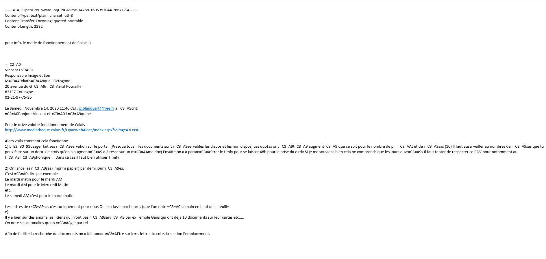 | Description | Hello everybody. I have a problem with 3 servers with Centos (Nethserver exactly) We are french. We have SOGo 5.0 . We have a problem on the 3 servers with the webmail of SOGo. If someone use the webmail and send a mail with a pdf file or special character like à é è etc... If the recipient is using Outlook Or android phone the mail appear like this : ------=_=-_OpenGroupware_org_NGMime-14268-1605357044.786717-4------ Content-Type: text/plain; charset=utf-8 Content-Transfer-Encoding: quoted-printable Content-Length: 2232 =C2=A0Bonjour Vincent et =C3=A0 l =C3=A9quipe If the recipient are using SOGo thunderbird zimbra google the mail is ok. Than'ks for your help. | ||||