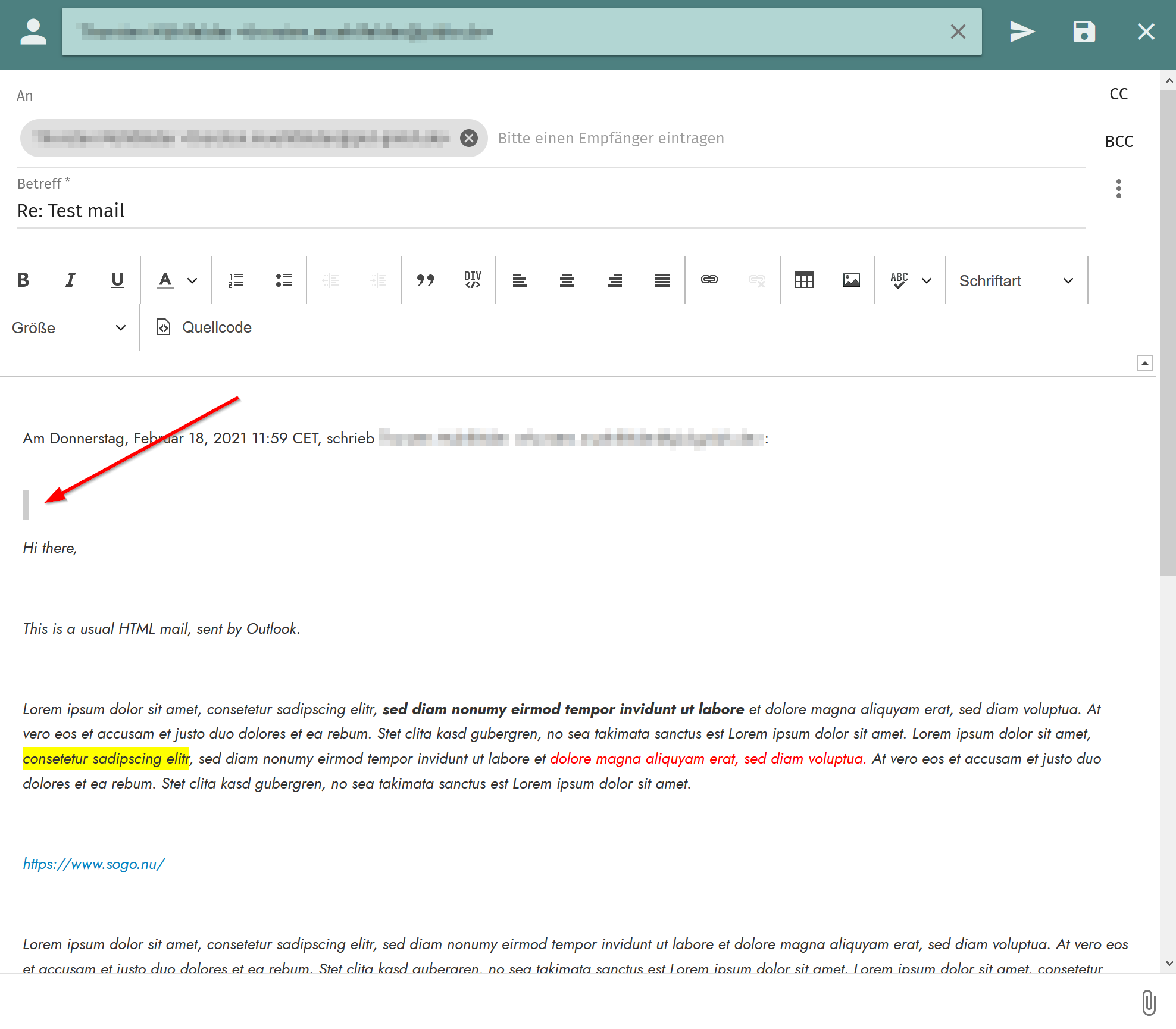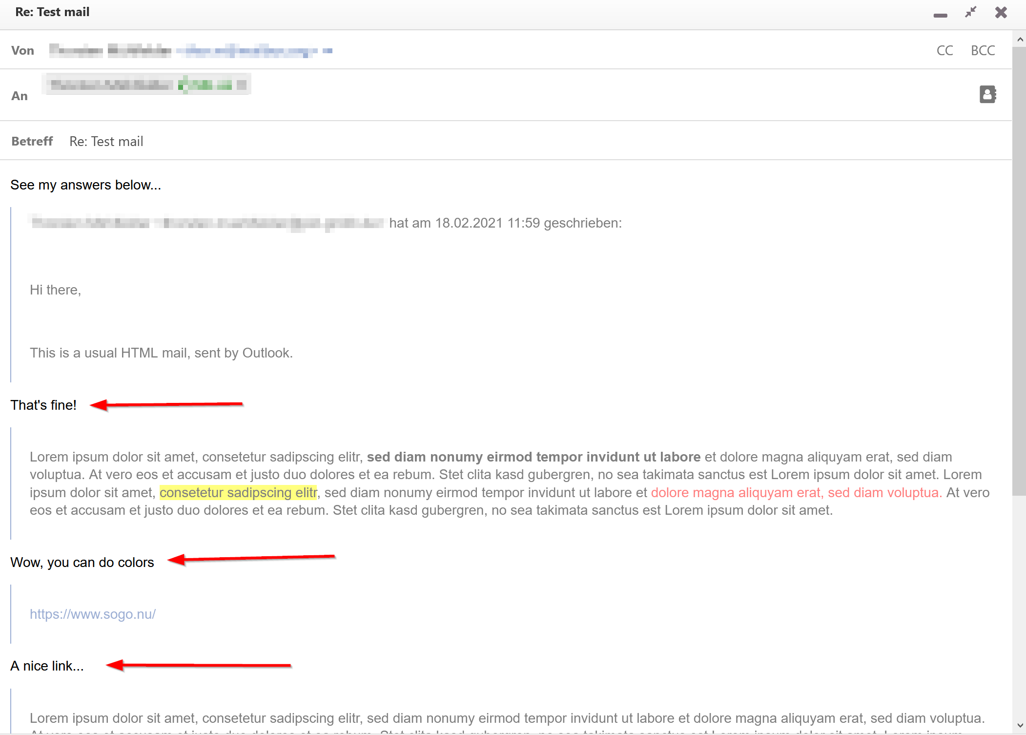 In SOGo I can manually format the quotation, but hen still it is impossible to interrupt it and add answers. |
