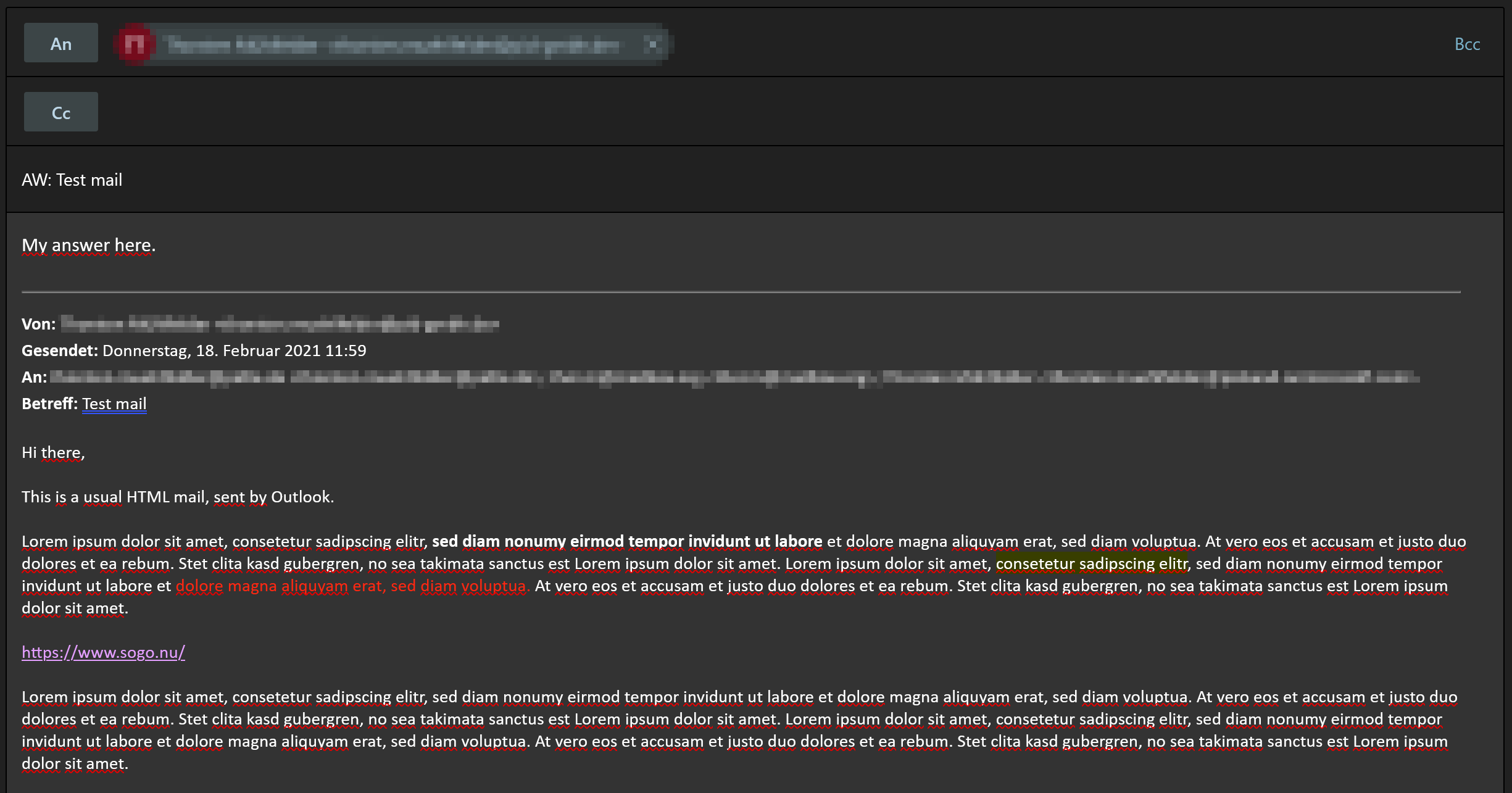 | Description | When replying to a plain text mail from the sogo web mail with html compositing enabled, quotation in plain text is broken, whereas the html looks fine: Answering this mail again with web mail, leads to wrong quotation in the html part too: In case you need more information, I could provide either screenshots or mails, but the issue should easily be reproducible with the sogo demo. | ||||