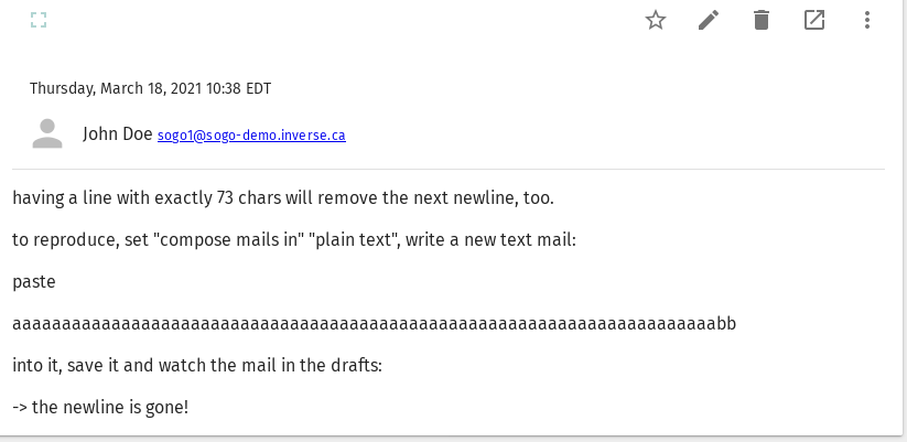 to reproduce, set "compose mails in" "plain text", write a new text mail: