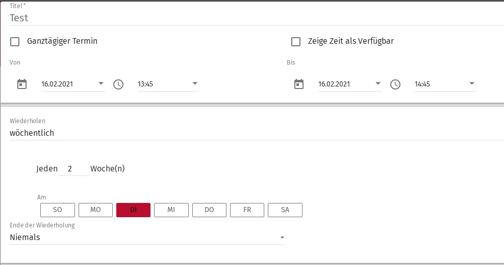 | Description | Because the Logic of appointments, which are repeated every n weeks is combined under the weekly repetition. The appointment is displayed as "weekly". This can confuse users. If the repetition is n weekly it should be displayed as such. I think this is the same with monthly and yearly. | ||||