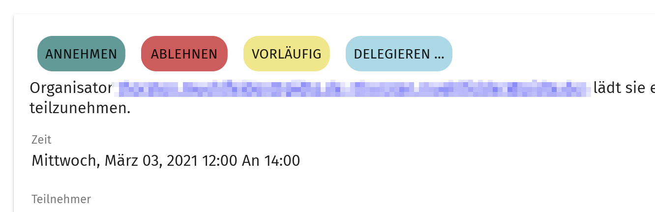 | Description | Hi, appointment invitation e-mails (RVSP) show buttons to accept/decline them. But in SOGo these buttons are really hard to see. See the attached example screenshots from SOGo, Exchange Online and OpenXchange: